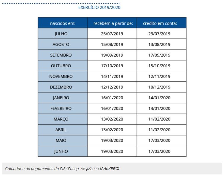 A data para o fechamento do calendário de pagamento do exercício 2019/2020 está prevista para o dia 30 de julho de 2020. A estimativa é de que sejam destinados R$ 19,3 bilhões a 23,6 milhões de trabalhadores.