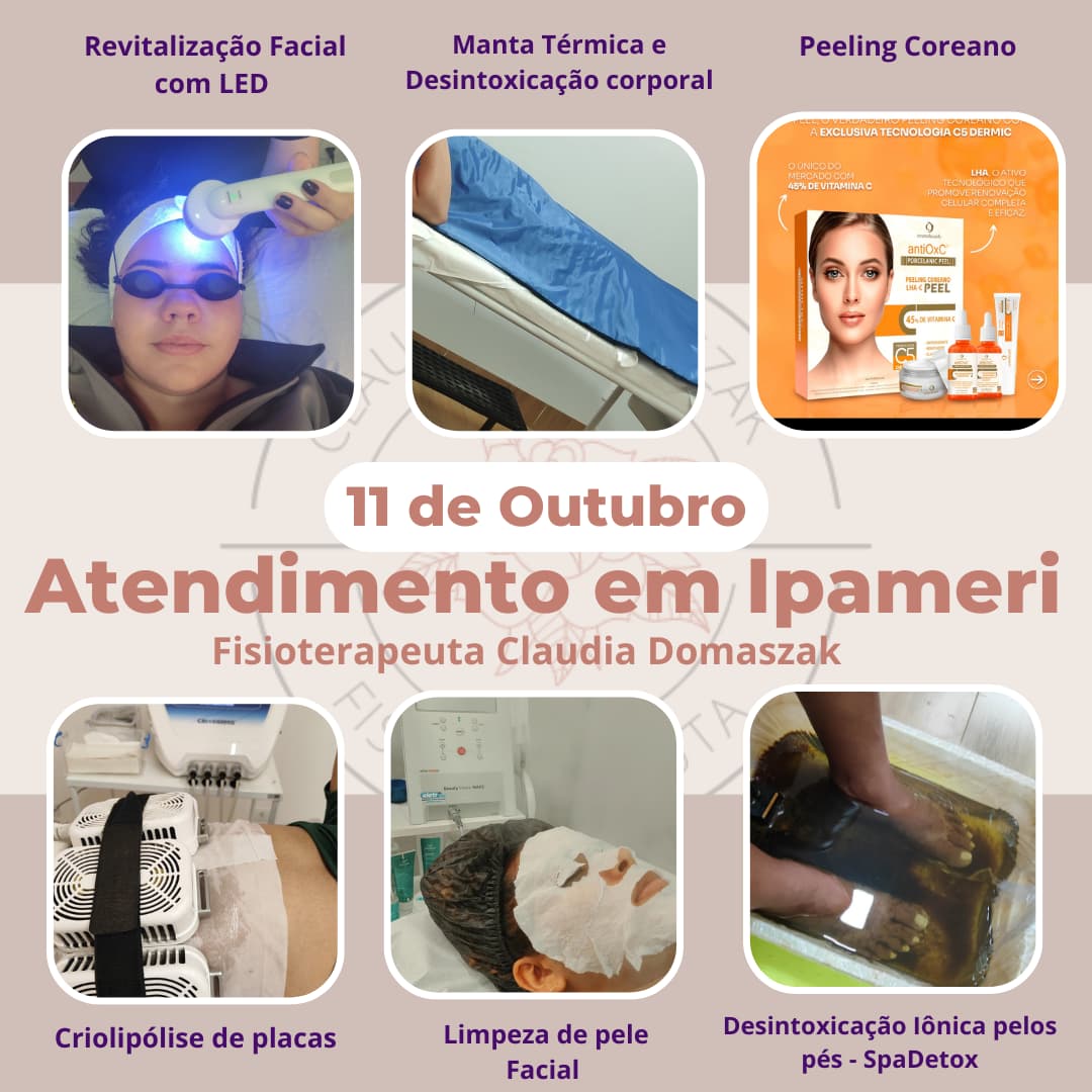 A fisioterapeuta Cláudia Domasza estará atendendo em Ipameri no próximo sábado dia 11/10 com alguns procedimentos estéticos faciais e corporais, e também com a desintoxicação Iônica pelos pés.