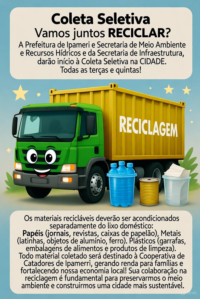 Ipameri dá início a uma nova era de conscientização ambiental com o lançamento da Coleta Seletiva na cidade. A iniciativa, promovida pela Prefeitura de Ipameri em parceria com a Secretaria de Meio Ambiente e Recursos Hídricos e a Secretaria de Infraestrutura, começa oficialmente nesta terça-feira, 21 de outubro de 2025, com coletas programadas para todas as terças e quintas-feiras.