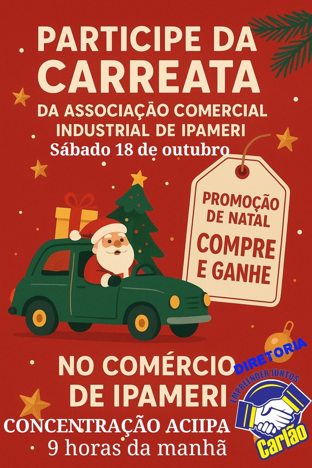 A Associação Comercial e Industrial de Ipameri (ACIIPA) convida todos os empresários, colaboradores e a comunidade em geral a participarem da grande carreata de divulgação da campanha de Natal “Compre e Ganhe”. A ação tem como objetivo incentivar as compras no comércio local e fortalecer os empreendedores da cidade neste fim de ano.