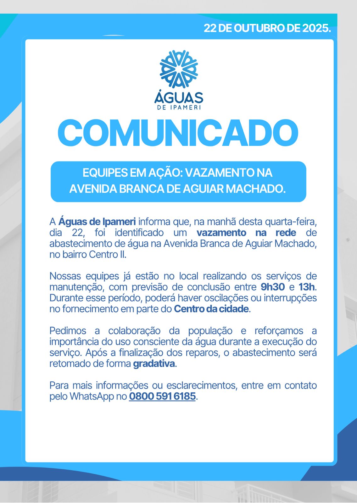 Para mais informações, os clientes podem entrar em contato com a Águas de Ipameri pelo WhatsApp: 0800 591 6185.