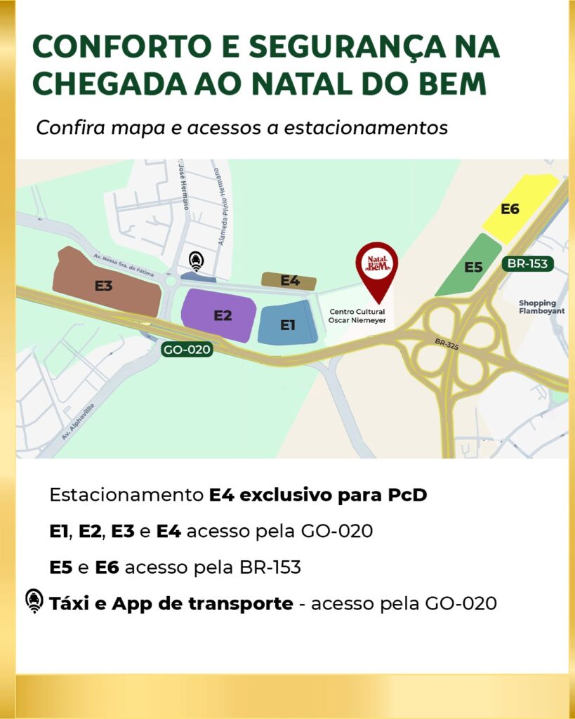 O Governo de Goiás oferecerá 12 mil vagas de estacionamento gratuitas durante a temporada 2025 do Natal do Bem, no Centro Cultural Oscar Niemeyer (CCON). A abertura oficial do evento será realizada nesta sexta-feira (14/11), com programação até o dia 4 de janeiro de 2026. Promovido pelo Goiás Social e pela Organização das Voluntárias de Goiás (OVG), o evento é a maior festa natalina gratuita do Brasil e deve receber 1,8 milhão de visitantes.