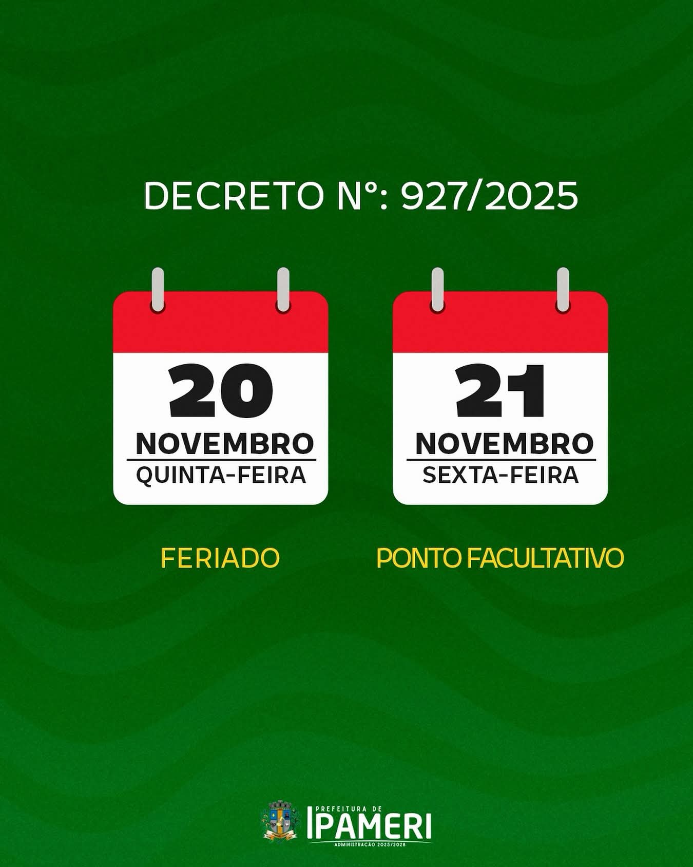 A Prefeitura Municipal de Ipameri publicou o Decreto nº 927/2025, que estabelece ponto facultativo para os servidores públicos municipais na sexta-feira, dia 21 de novembro de 2025. A medida considera o feriado nacional do Dia de Zumbi e da Consciência Negra, celebrado no dia 20 de novembro.