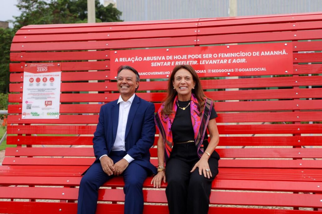 Coordenadora do Goiás Social, primeira-dama Gracinha Caiado, entrega Banco Vermelho à população de Goiânia para alertar sobre o combate ao feminicídio
