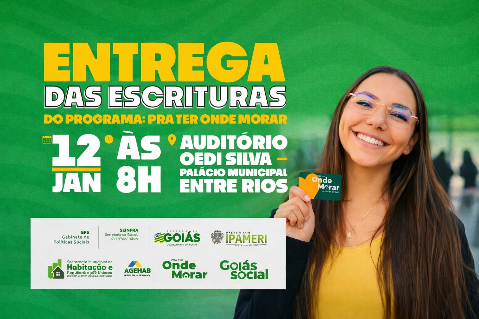 A solenidade será realizada às 8h, no Auditório Oedi Silva – Palácio Municipal Entre Rios, localizado na Avenida Pandia Calógeras, nº 84, Centro, em Ipameri. Autoridades, beneficiários e a comunidade em geral estão convidados a participar deste momento histórico para o município.