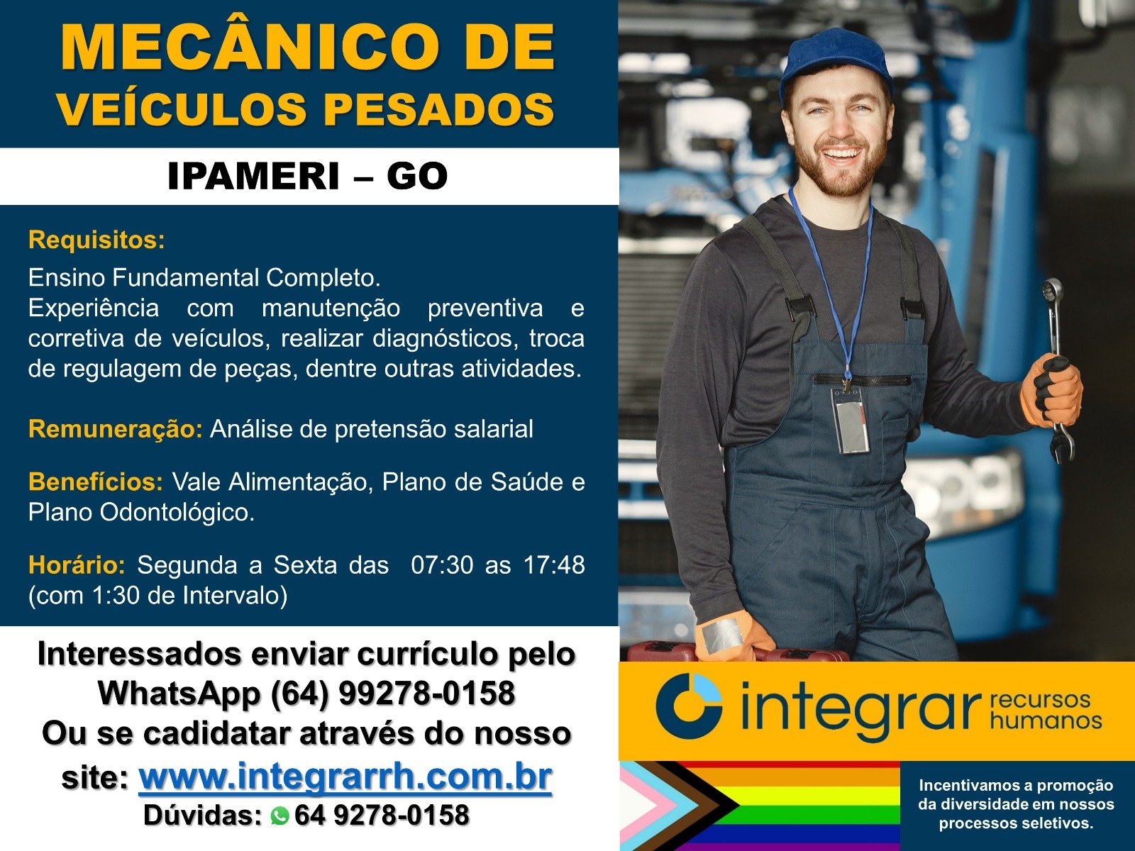 A Integrar Recursos Humanos está com oportunidade aberta para Mecânico de Veículos Pesados, no município de Ipameri – GO.