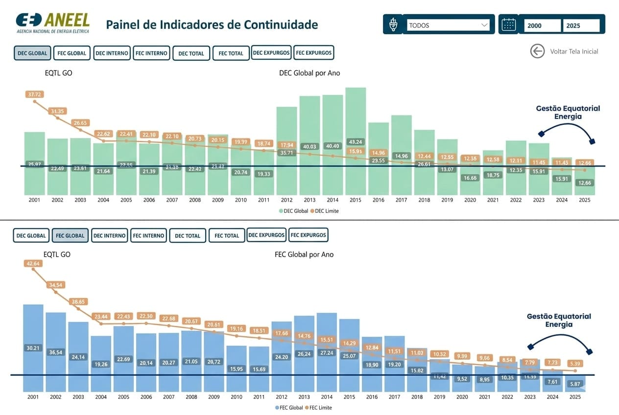 Goiânia, 2 de março de 2026 – Os indicadores que medem a qualidade do fornecimento de energia em Goiás atingiram os menores patamares já registrados na série histórica da Agência Nacional de Energia Elétrica (ANEEL). Os números de 2025 consolidam um marco para o sistema elétrico goiano: 12,66 horas no DEC e 5,87 vezes no FEC, ambos os melhores resultados desde 2001.