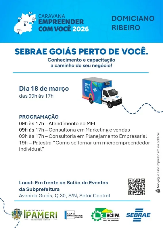 No próximo dia 18 de março de 2026, o distrito de Domiciano Ribeiro recebe duas importantes iniciativas voltadas ao fortalecimento do empreendedorismo e ao apoio aos pequenos negócios: a Caravana Empreender com Você 2026, do Sebrae Goiás, e o programa GoiásFomento até Você, ligado ao Governo de Goiás.