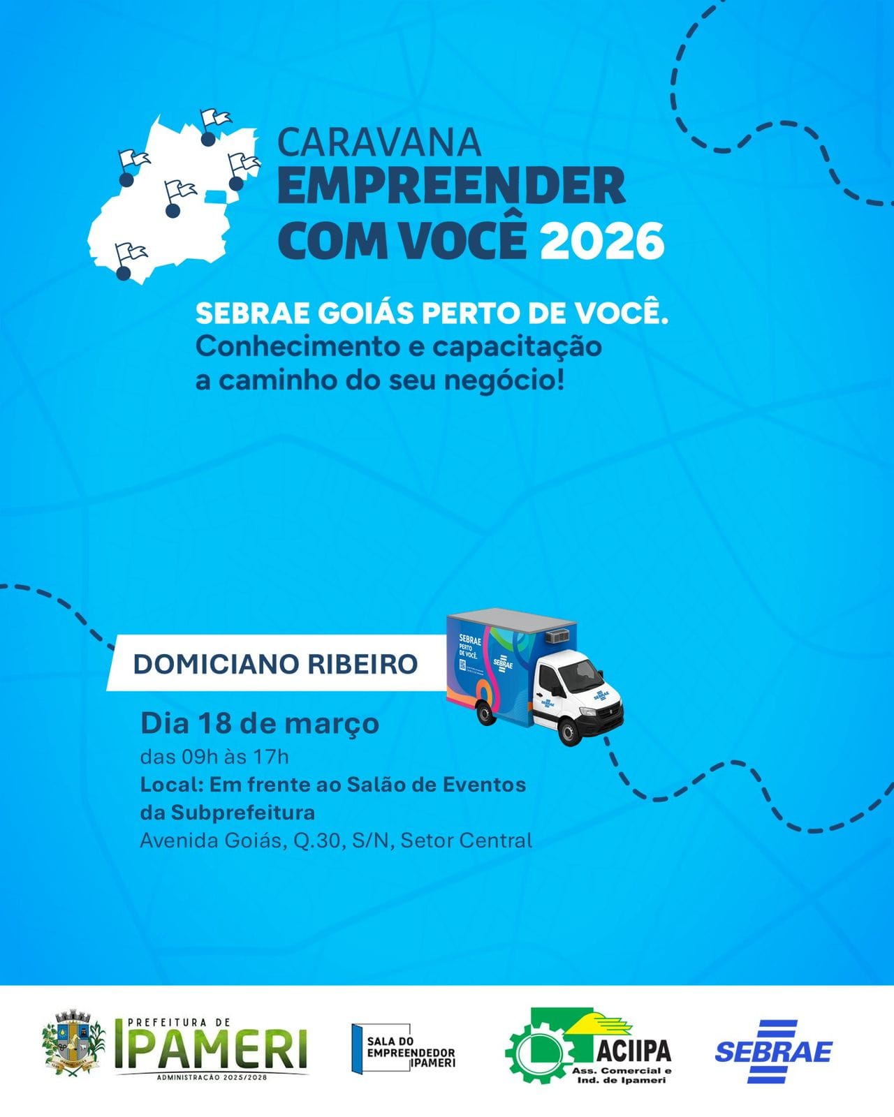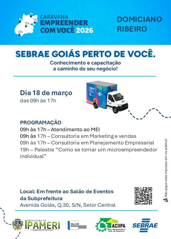 A Caravana Empreender com Você 2026 consolida a estratégia do Sebrae Goiás de atender todos os empreendedores de Goiás, seja na capital ou no interior. Em Ipameri, a parada será no distrito de Domiciano Ribeiro, nesta quarta-feira, 18, das 9h às 17h, em frente ao salão de eventos da subprefeitura. Durante o dia os consultores estarão fazendo atendimento e consultorias em marketing, vendas e planejamento empresarial. A partir das 19h, a população vai contar com a palestra “Como se tornar um microempreendedor individual”. Além do atendimento dos atendimentos o Sebrae também vai até o empreendedor com a Unidade Móvel de Atendimento e leva informação e orientação especializada sobre empreendedorismo. A jornada do “caminhão do Sebrae Goiás” teve início em fevereiro e, ao longo do ano, percorrerá todas as regiões do estado.