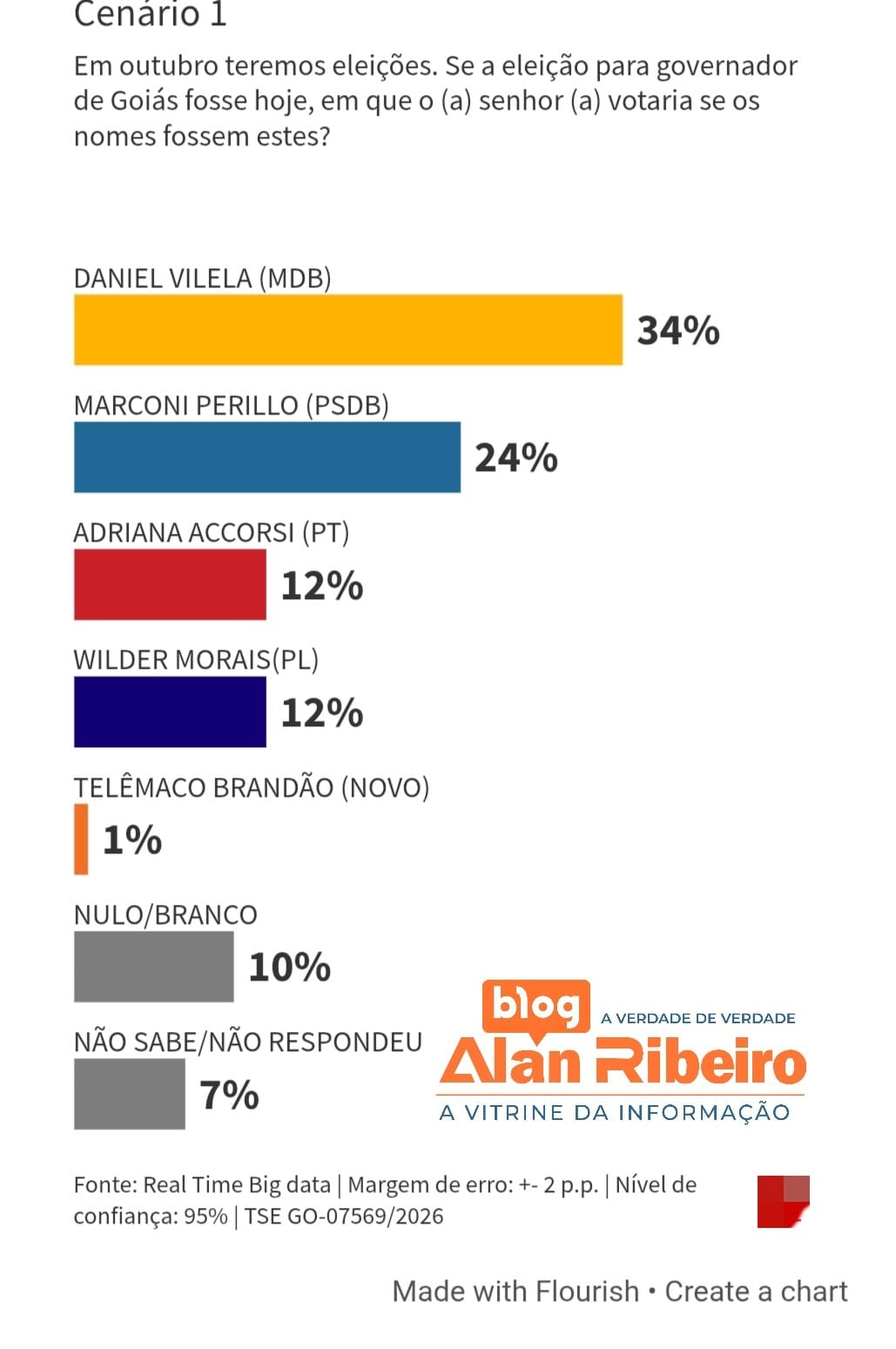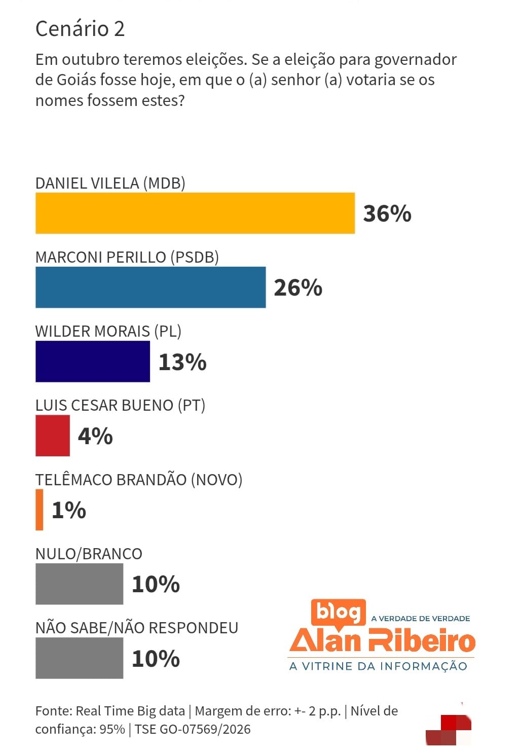 O Real Time Big Data ouviu 1,5 mil eleitores entre os dias 16 e 17 de março. A pesquisa foi contratada pelo próprio instituto, e o nível de confiança é 95%, com margem de erro de 2 pontos percentuais para mais ou para menos. Registro no TSE sob o nº GO-07569/2026.