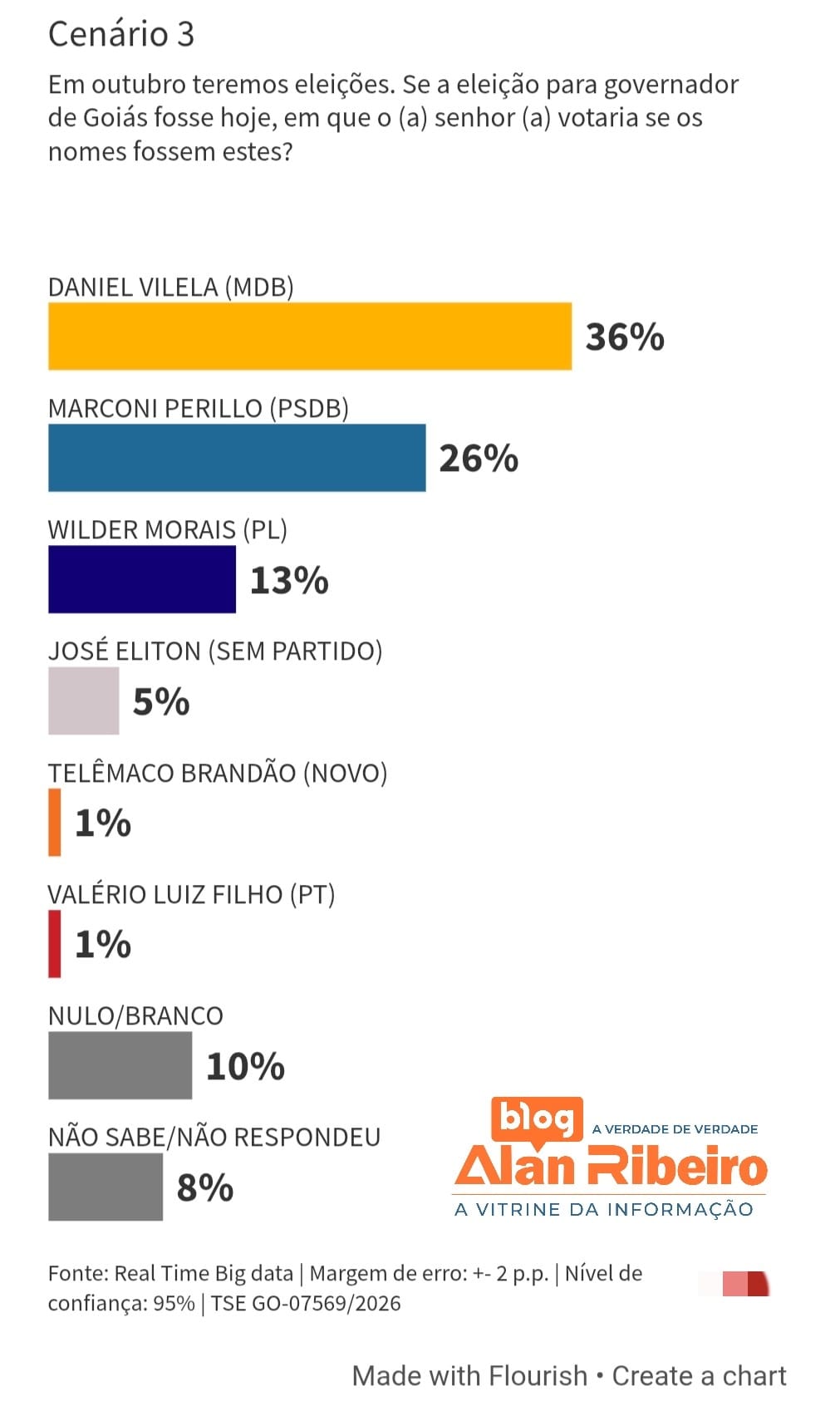 No terceiro cenário, os pré-candidatos de esquerda apresentados ao eleitor são dois: o ex-governador José Éliton (sem partido), que teve o nome cogitado por PSB e PT, e o advogado Valério Luiz Filho (PT). Neste cenário, Daniel Vilela lidera com 36%, Marconi tem 26%, Wilder 13%, José Éliton 5% e Valério 1%.