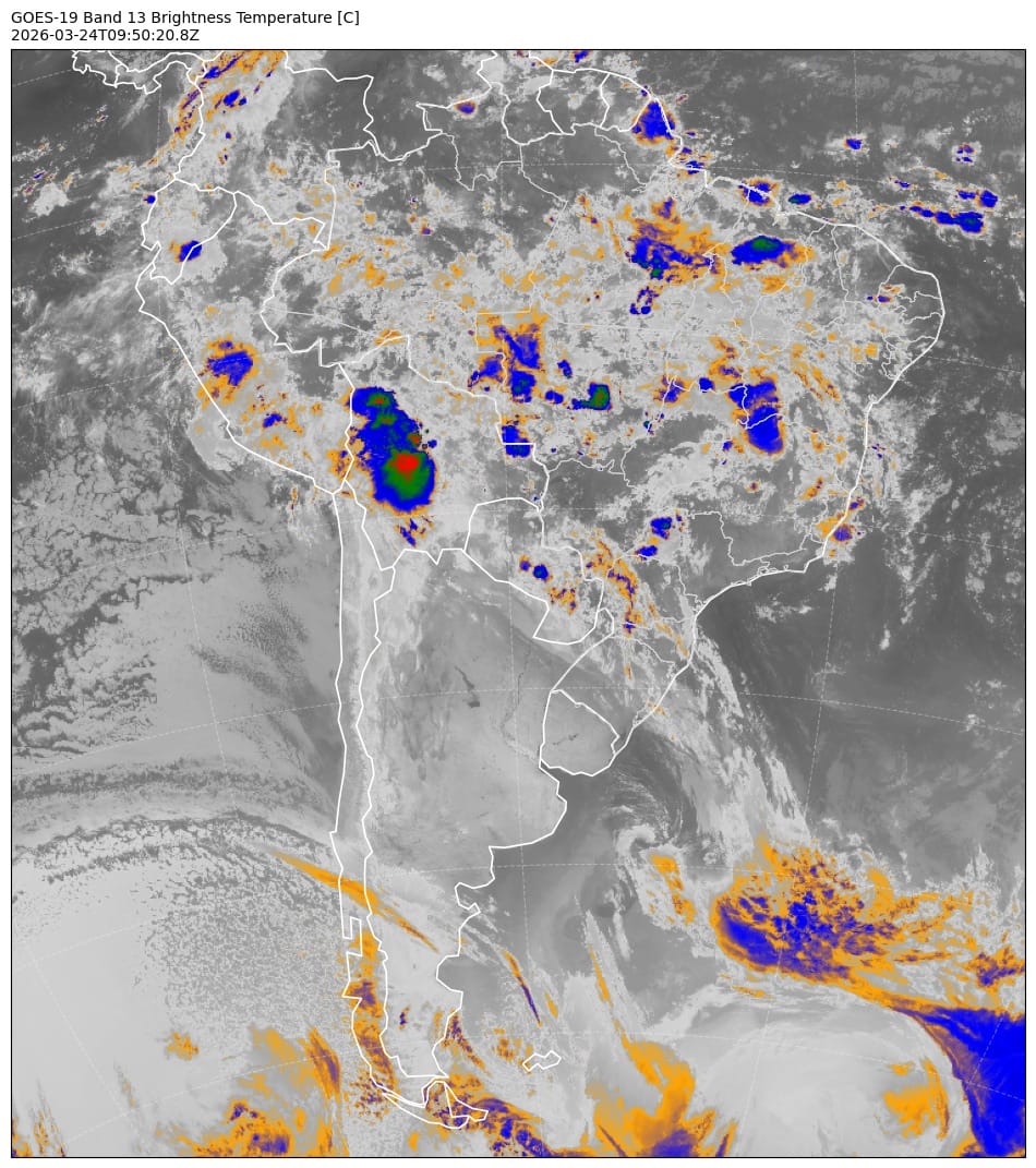 Na análise da imagem de satélite desta terça-feira (24/03) temos muita nebulosidade sobre região amazônica, nos Estados do Tocantins, Goiás, Minas Gerais, São Paulo e Bahia, o que favorece a formação de áreas de instabilidade nestes Estados.