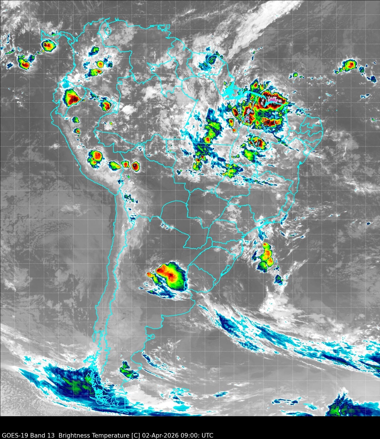 Na análise da imagem de satélite desta quinta-feira (02/04) temos aumento de nebulosidade sobre região amazônica, como também em Goiás, Minas Gerais, São Paulo e Tocantins, com isso poderemos ter pancadas de chuvas irregulares e também tempestades.