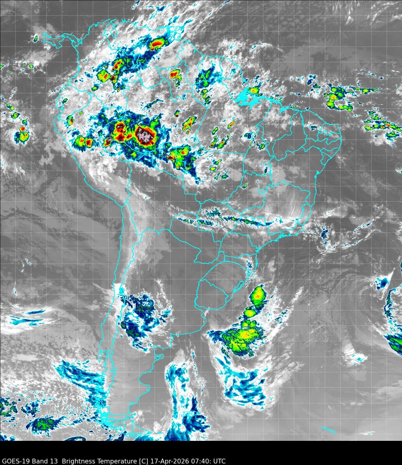 A análise das imagens de satélite desta manhã confirma o enfraquecimento do bloqueio atmosférico que dominava o Brasil Central. O sistema de alta pressão dissipou-se, permitindo que o fluxo de umidade vindo da Região Amazônica volte a convergir sobre o estado. Observa-se a formação de um corredor de umidade que conecta o Norte do país ao Sudeste, atravessando Goiás. Esse cenário encerra o período de estabilidade que ocorreu durante a semana e propicia um padrão típico de verão, com maior presença de nebulosidade e núcleos convectivos em desenvolvimento.