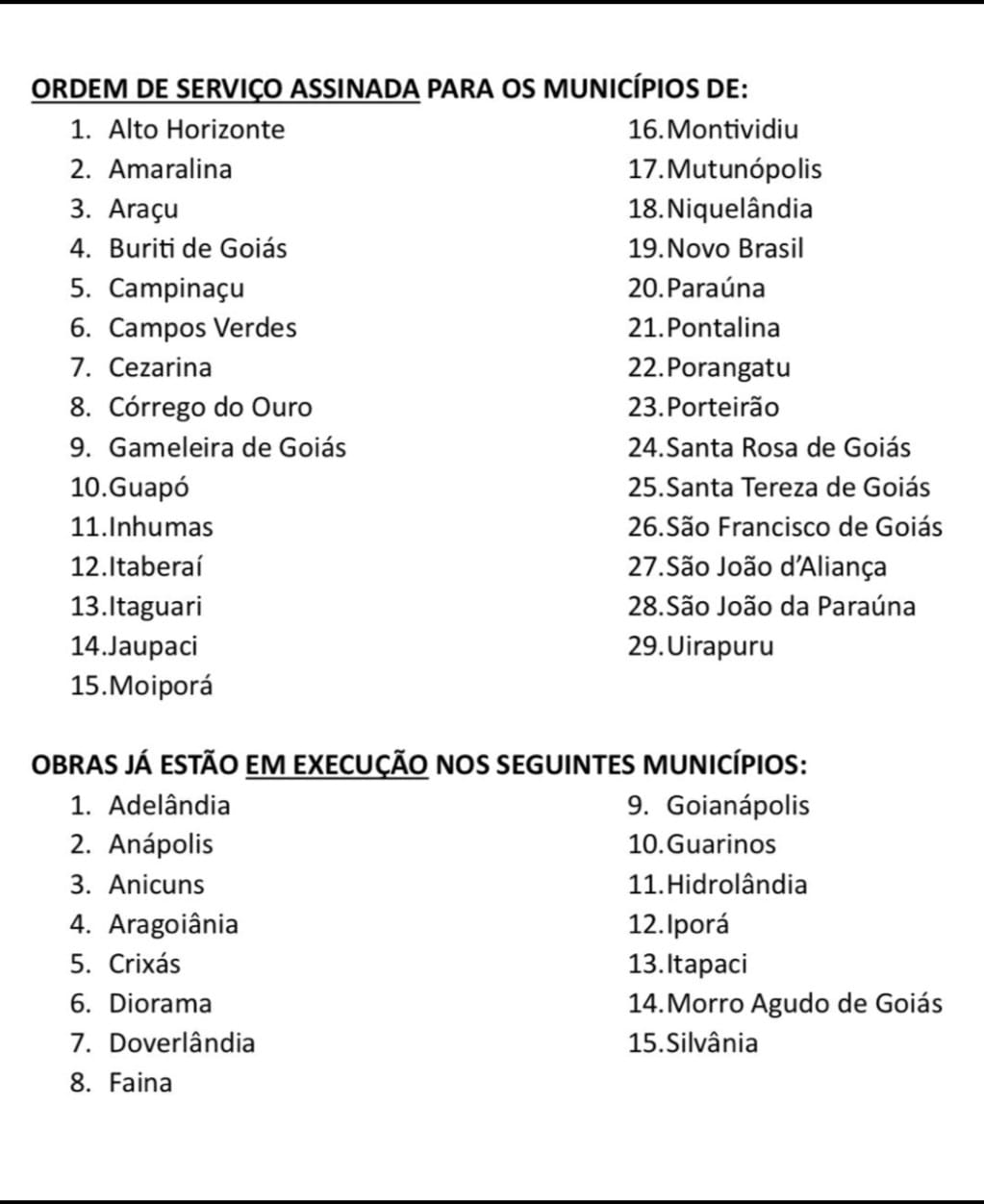 As obras são realizadas sem nenhum custo para os municípios. “Vem ao encontro da necessidade de escoamento da produção, em trazer os insumos agropecuários para que essa produção seja ainda melhor. Vem ao encontro do anseio de uma população que, há décadas, espera esse benefício”, reforçou o presidente da Associação Goiana de Municípios (AGM) e prefeito de Hidrolândia, Zé Délio. “O município só vem trazer qual é a demanda imediata, qual é o local e o ponto que é mais necessária essa intervenção do Estado”, acrescentou.