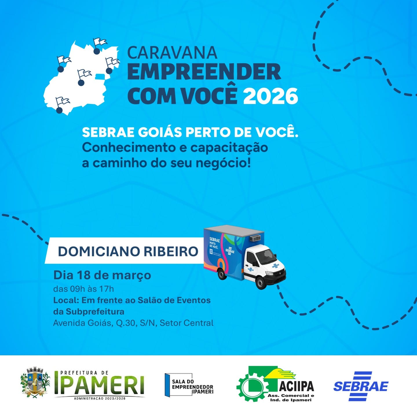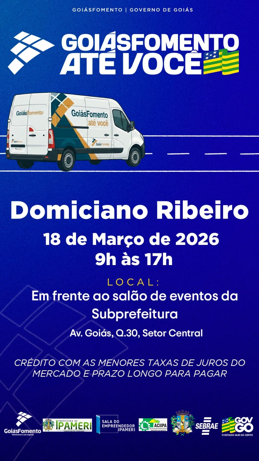 No próximo dia 18 de março de 2026, o distrito de Domiciano Ribeiro recebe duas importantes iniciativas voltadas ao fortalecimento do empreendedorismo e ao apoio aos pequenos negócios: a Caravana Empreender com Você 2026, do Sebrae Goiás, e o programa GoiásFomento até Você, ligado ao Governo de Goiás.